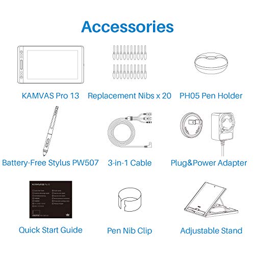 Der KAMVAS Pro 13 ist mit Huions neustem batterielosen PW507 Eingabestift und einem neuen Stifthalter, der PH05 in Donut-Form in der sich 10 Stiftspitzen und ein Stiftheber befinden, ausgestattet.